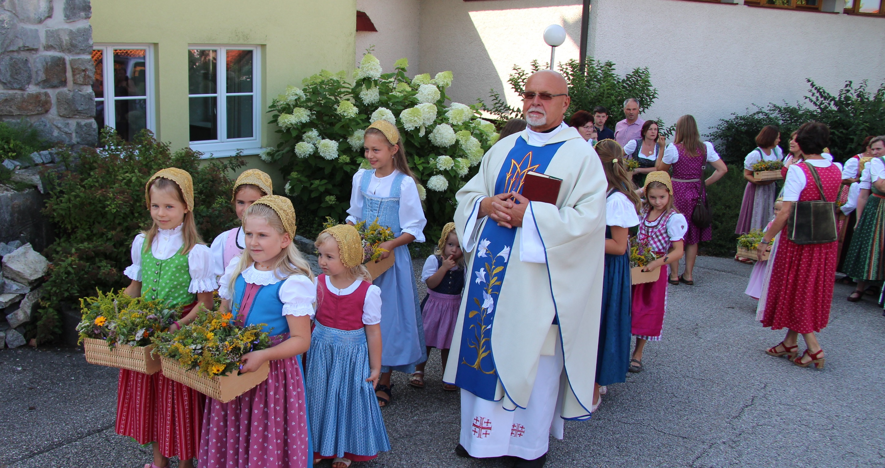 Es wurden 235 Kräuterbüscherl gebunden und diese dann in kleinen Körbchen von unseren Häubchenmädchen, in Begleitung der Musikkapelle, Pfarrer, Goldhaubenfrauen und Kirchenbesucher, in die Kirche getragen. Am Ende des Gottesdienstes wurden die "Büscherl" von Pfarrer Kons.-rat Kret gesegnet. Der Tag der "Kräuterweihe" wurde wieder bei einem gemütlichen Frühschoppen abgeschlossen.